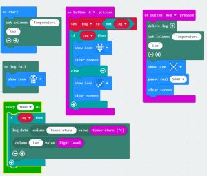 Lo que hace este programa es tomar la lectura de temperatura y luz, al presionar la letra “A” pone un corazón en la matriz de LED de tu microbit e inicia la lectura de valores cada segundo, actualiza dicha lectura, te sugerimos, tengas un muestreo de al menos 20 segundos.