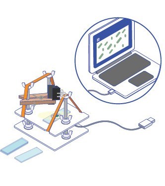 Este kit es especialmente bueno para examinar microorganismos en muestras de agua. La cámara web básica tiene un campo de visión de aproximadamente un milímetro, ¡lo suficientemente pequeño como para ver claramente cosas como plancton, amebas y tardígrados! También se puede combinar con una herramienta de recolección de muestras como BabyLegs a medida que investigas diferentes tipos de contaminación en tu agua.