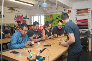 Dentro de las actividades del Meet the Makers con Mind the Gap y CEDIC, los asistentes aprendieron a soldar y conocieron algunos componentes básicos de su primera placa electrónica en forma de la mascota de la Maker Faire CDMX. También interactuaron con Kits de Robolution, un sistema de construcción creativa a base de cartón.