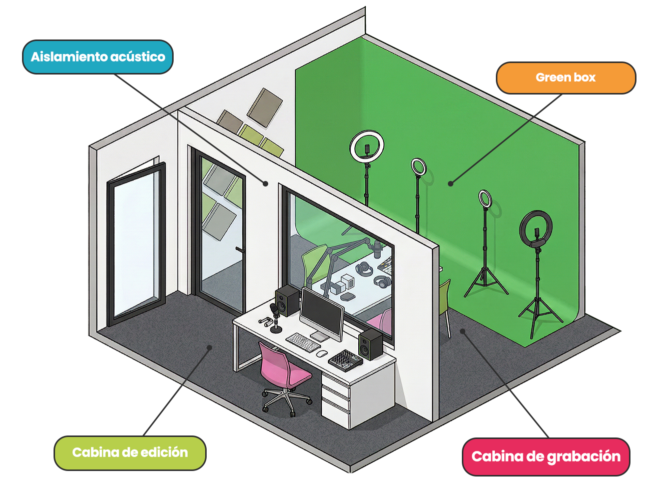 Es un espacio de creación audiovisual que ofrece todo lo necesario para la producción y postproducción de contenidos en formato de audio (podcasting) o video (vidcasting) para aprovechar nuevas maneras de expresión y comunicación.