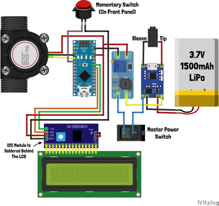 El dispositivo consiste en un Arduino conectado a un medidor de flujo de agua de Banggood. El sensor consiste en una rueda de paletas que se asienta en el flujo de agua, equipada con un imán. Un sensor de efecto Hall capta pulsos a medida que gira el imán, y al contarlos se puede medir el caudal. Se utiliza una pantalla LCD HD44780 para mostrar las lecturas, controlada a través de I2C.