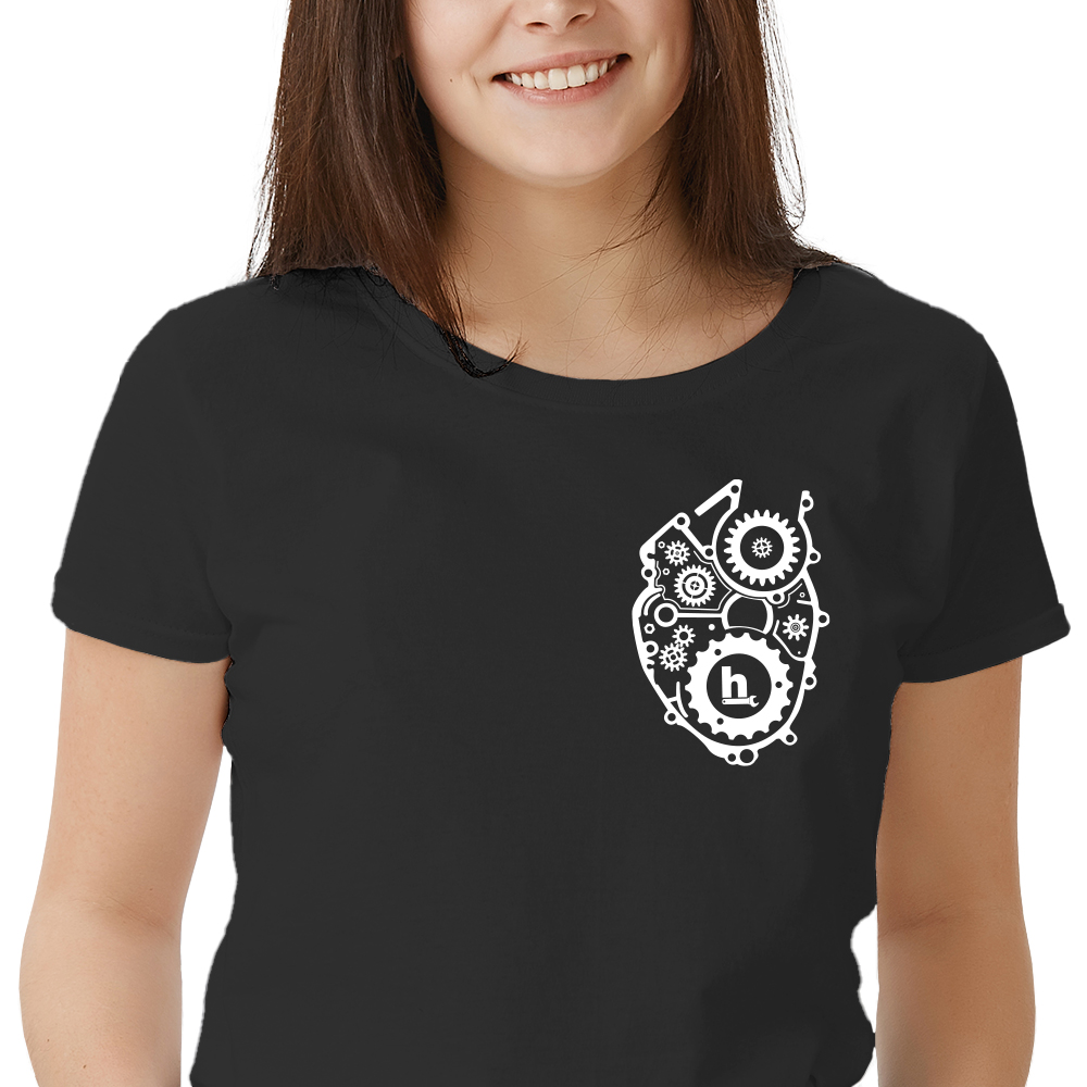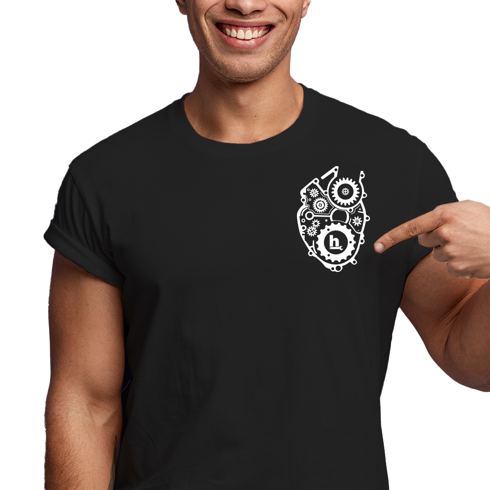 Playera confeccionada en tejido de algodón compacto 100%. Cuello redondo, manga corta y de color negro. Estampado serigráfico frontal con el corazón maker y posterior con la identidad gráfica de Hacedores.
